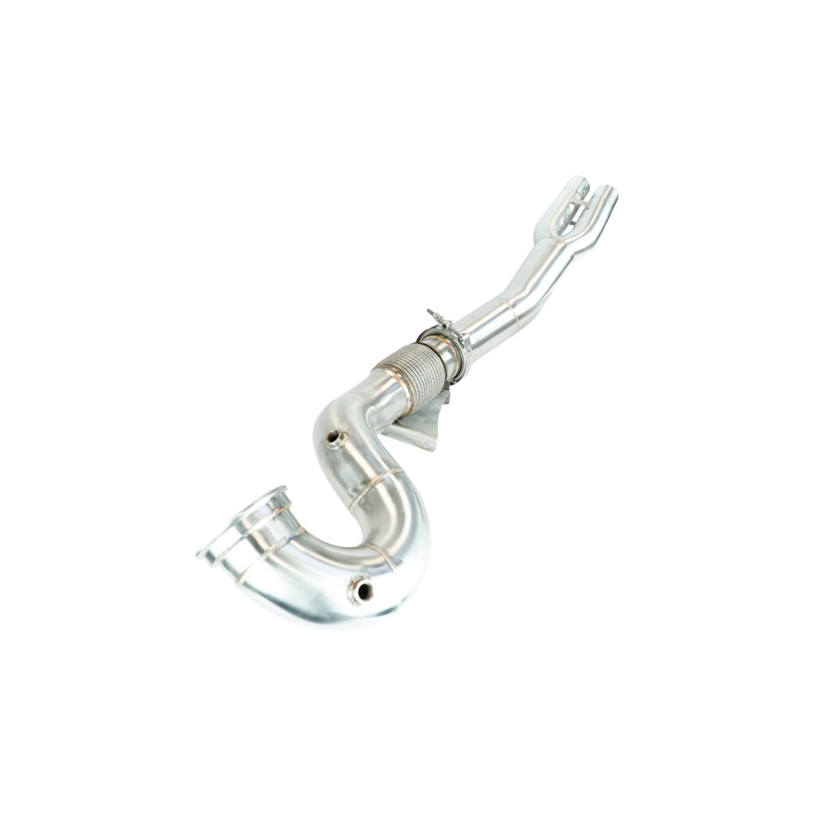Il Downpipe Black Mamba 3,5″ (90 mm) per Audi RS3 8.5V e TTRS Mk3 2.5 TFSI Evo, sapientemente realizzato in pregiato acciaio inox T304. Questo downpipe ad alto flusso è progettato per garantire il massimo flusso di scarico e un suono aggressivo e offre uno scudo termico opzionale in acciaio inossidabile per ridurre il calore del vano motore. Si collega direttamente dal turbo al sistema di scarico OEM o aftermarket.