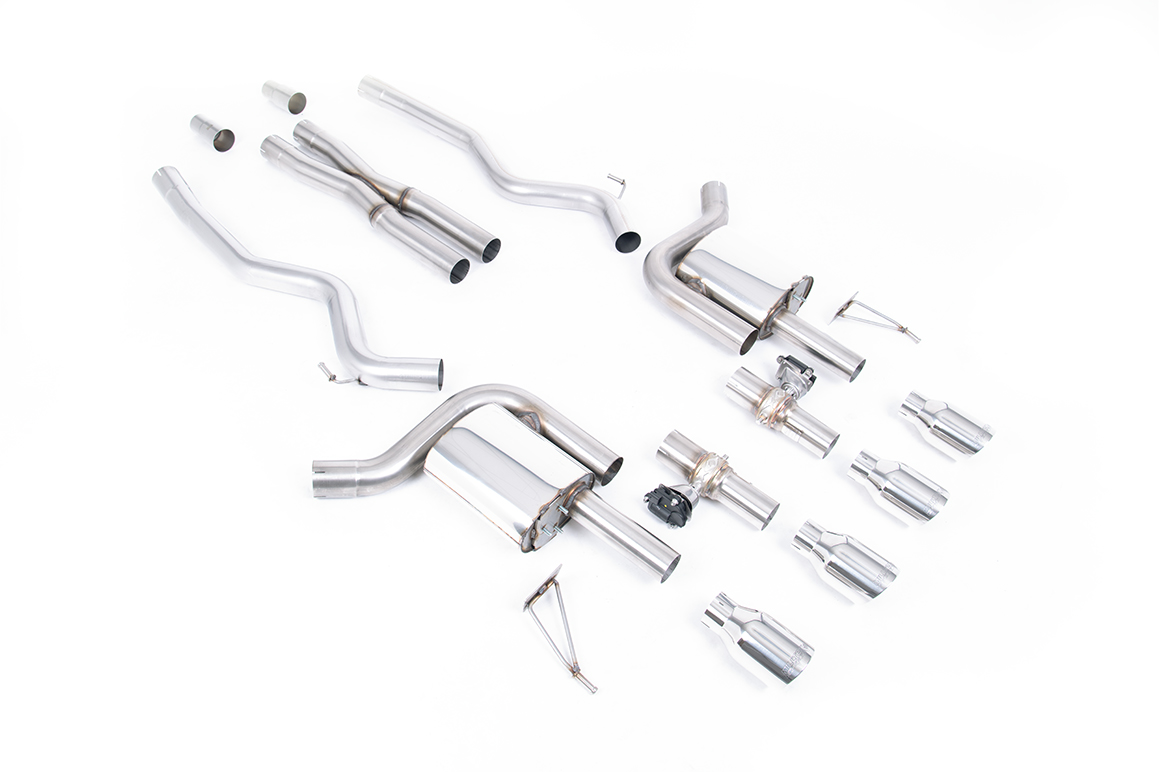 TYPE OF SYSTEM Cat-back – Active Valved Cat Back with X Pipe and GT-100 / 4′ Polished Tips